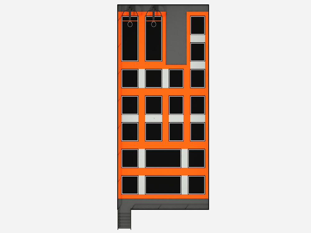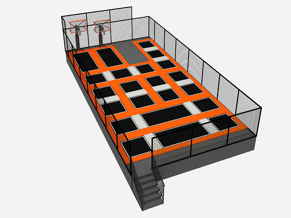 This adult trampoline park features a well-organized layout with interconnected trampolines for freestyle jumping, cardio workouts, and balance training. The design includes basketball dunk zones, allowing users to experience high-flying action, while ensuring safety with sturdy netting and non-slip padding. The bold color scheme creates a dynamic atmosphere, making it ideal for fitness and fun, catering to adults and teenagers looking for both exercise and entertainment in one space.