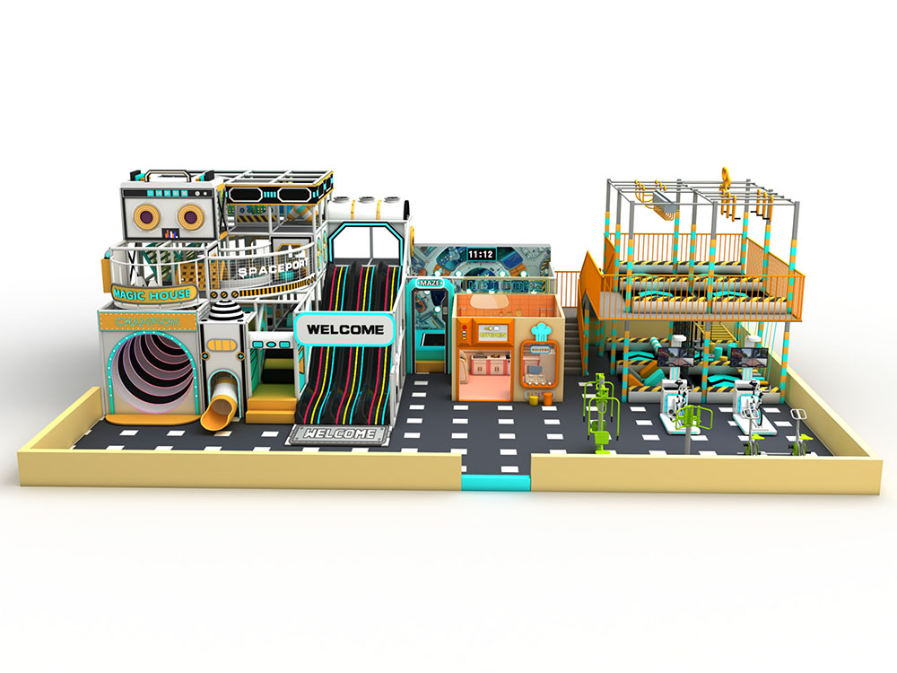 This indoor playground is designed as an adventure playroom, offering a mix of exciting features. It includes a large maze, slides, climbing structures, and interactive play areas. The vibrant colors and creative layout, with elements like a space-themed tunnel and obstacle course, create an adventurous atmosphere for kids.
