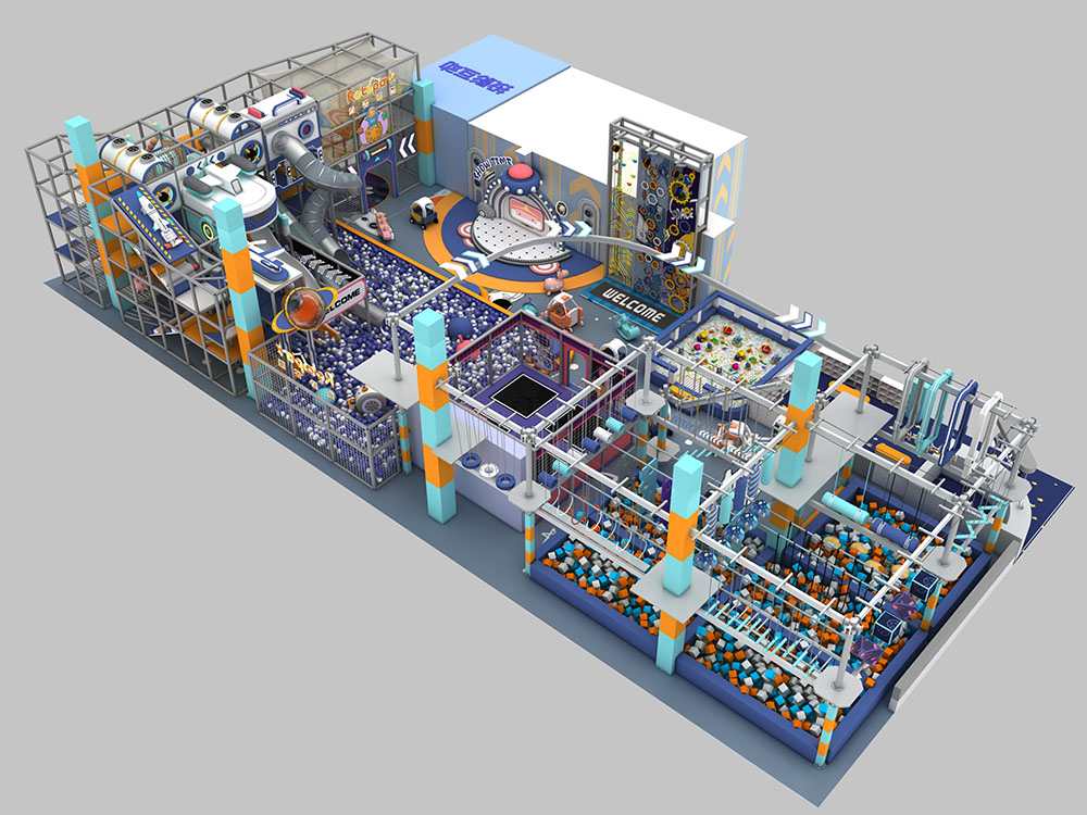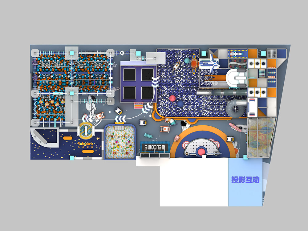 This mall playground is a vibrant and engaging space designed to offer children an exciting and safe environment to explore. It includes a variety of play zones such as a ball pit, climbing walls, slides, and interactive games. The futuristic theme with its playful robot design and bright colors adds an element of adventure to every corner. Kids can enjoy endless activities while improving coordination and building social skills.