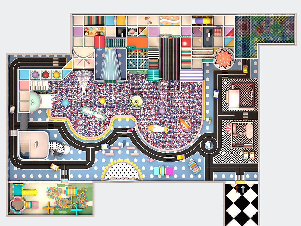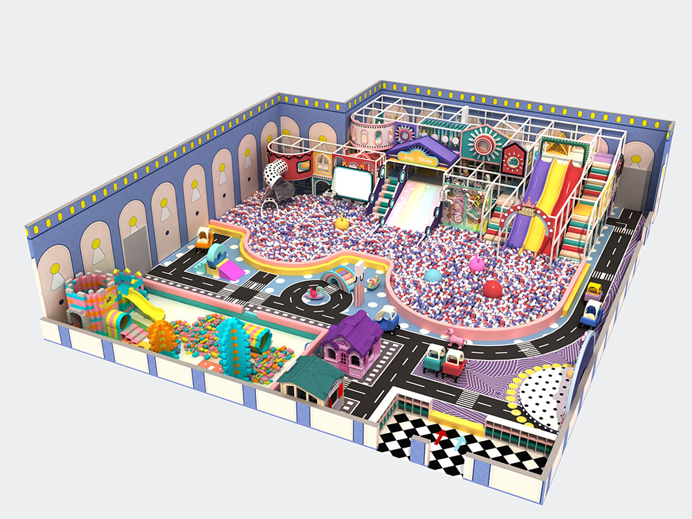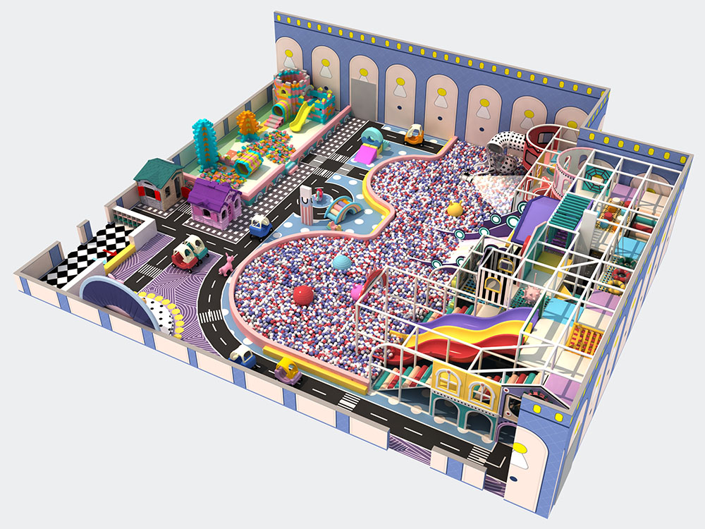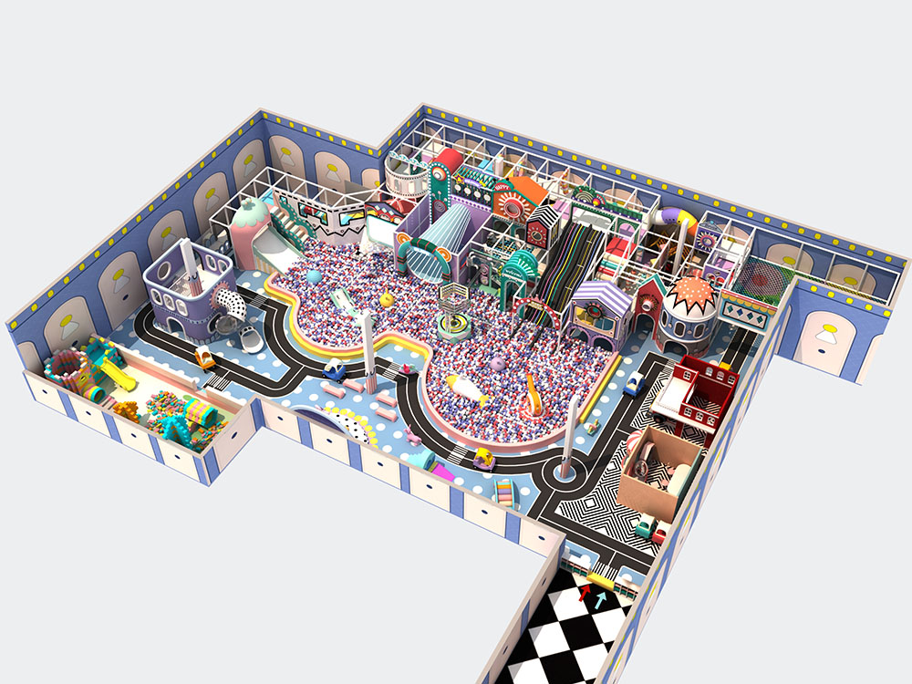 Perfect for family-friendly entertainment, the city indoor playground also includes themed play zones with candy-colored structures and imaginative playhouses. The design encourages both physical activity and creative exploration, making it ideal for malls, recreation centers, and urban locations.
