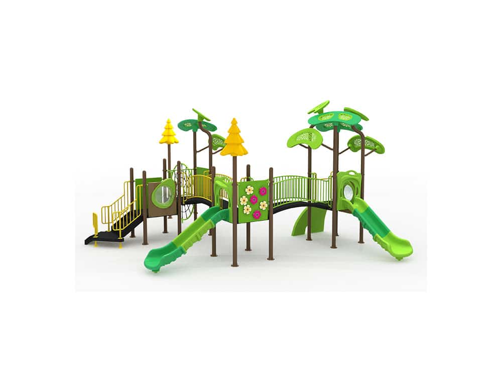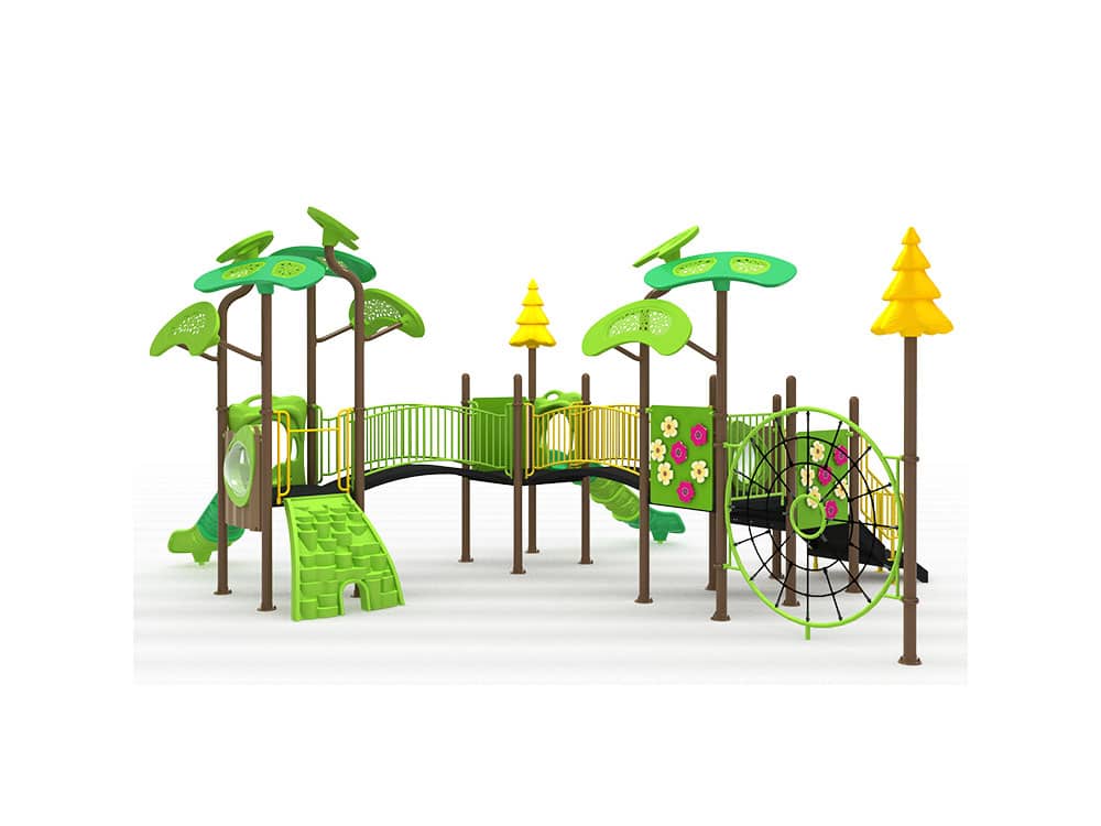 Our Custom playground equipment brings immersive, nature-inspired fun to public playgrounds, designed for kids aged 3–12. Built from durable, non-toxic materials and certified to strict safety standards, this playscape features multiple slides, tree-like climbing frames, elevated walkways, and interactive floral panels. Every component has smooth edges and anti-slip surfaces to keep children safe during active play. Its weather-resistant build withstands sun, rain, and heavy daily use, resisting fading, cracking, and rust for long-lasting performance. Fully customizable to fit any park layout, it blends seamlessly with natural landscapes while encouraging physical activity, social interaction, and imaginative play for communities of all sizes.