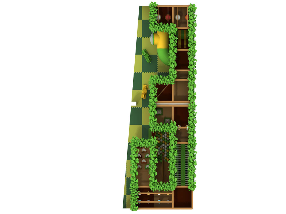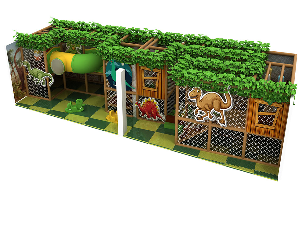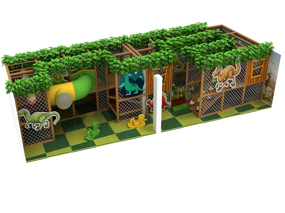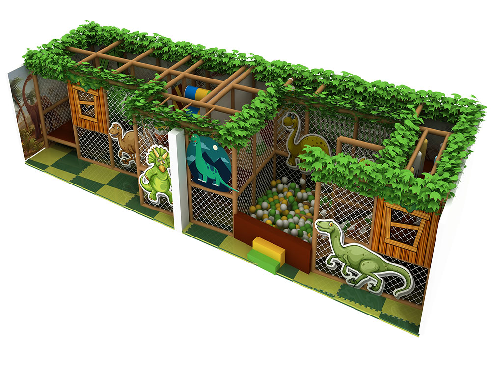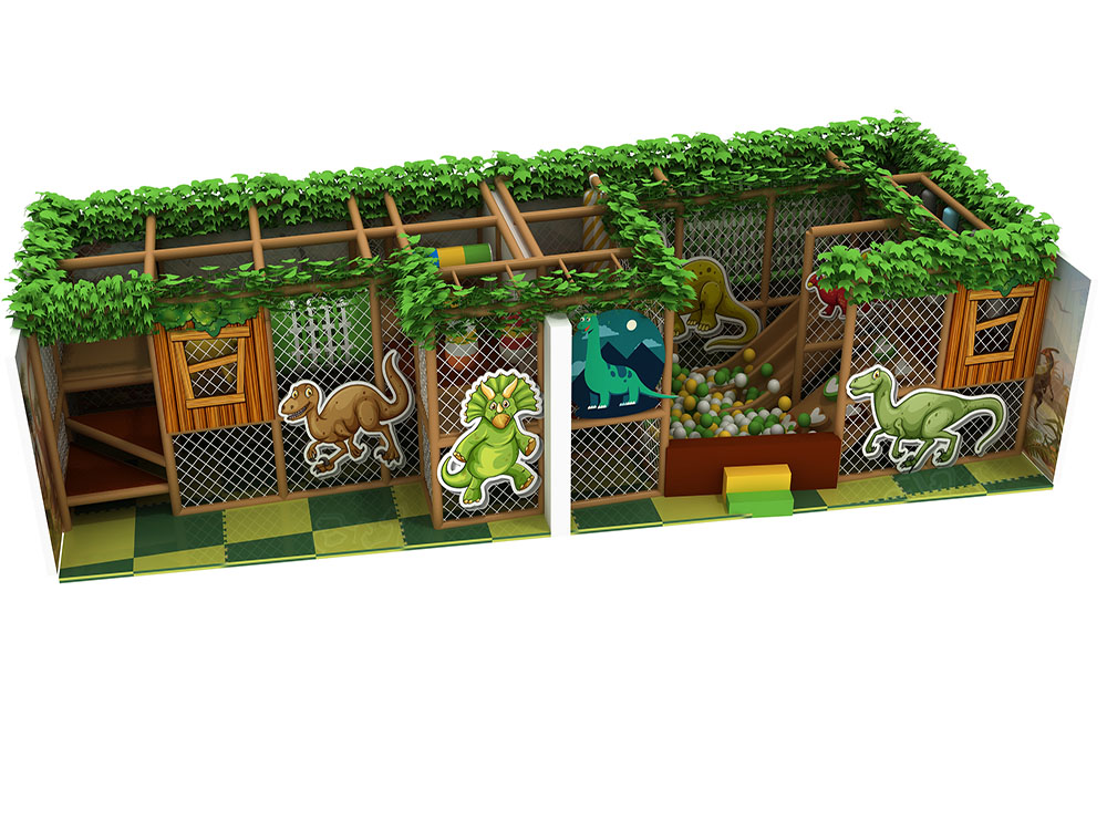 This forest-themed soft play area features a wood-style frame, leafy green details, and animal graphics that create an immersive jungle atmosphere. The dark green playroom integrates tunnels, climbing nets, slides, and a ball pit within a safe netted structure, encouraging children to explore and move freely. With soft flooring and nature-inspired colors, the dark green playroom is ideal for malls and indoor parks seeking an adventurous yet warm play experience for young kids.