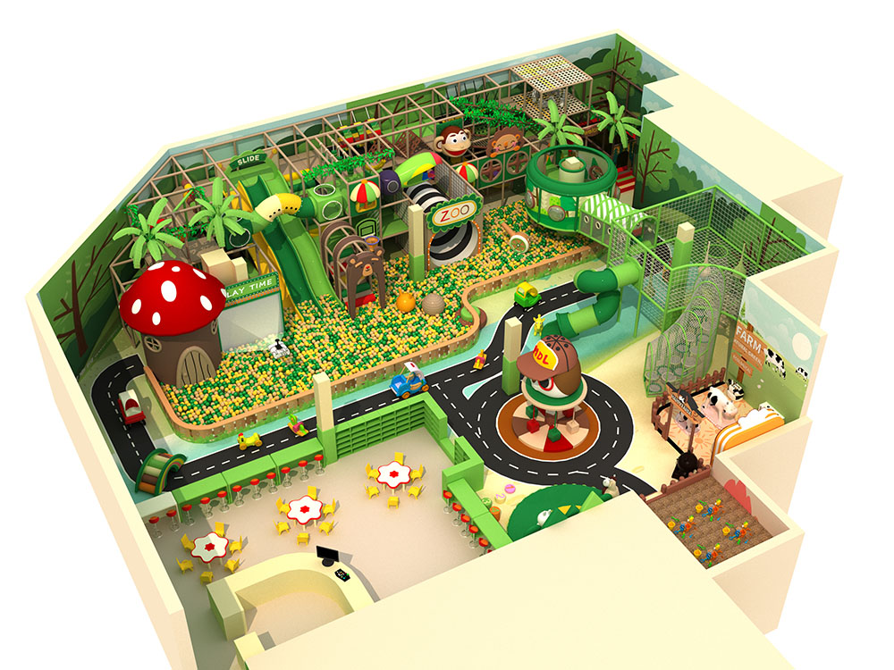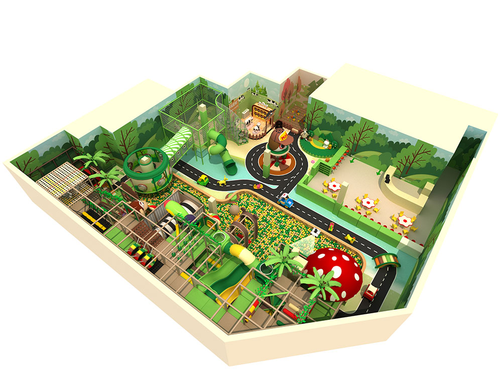 This forest playroom features a lush green theme with natural elements such as trees, plants, and woodland creatures. The play area is designed with fun structures like slides, tunnels, and a jungle-themed ball pit. Kids can explore an interactive zoo area, with animal-shaped play elements and a mini farm, creating an immersive forest adventure experience.