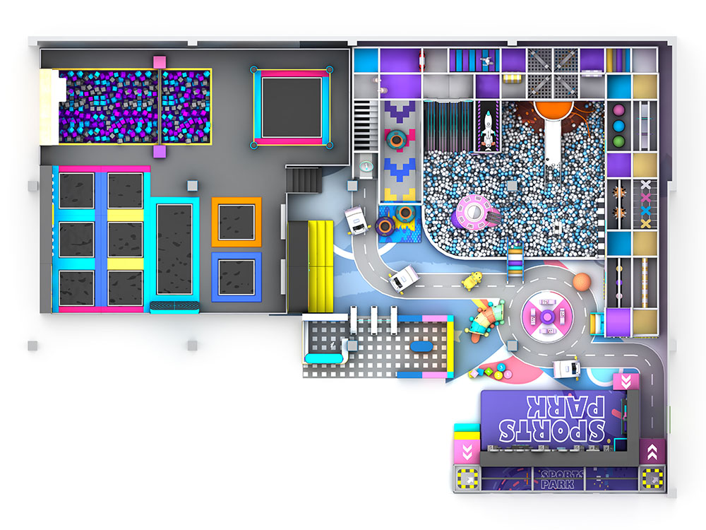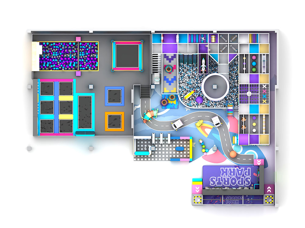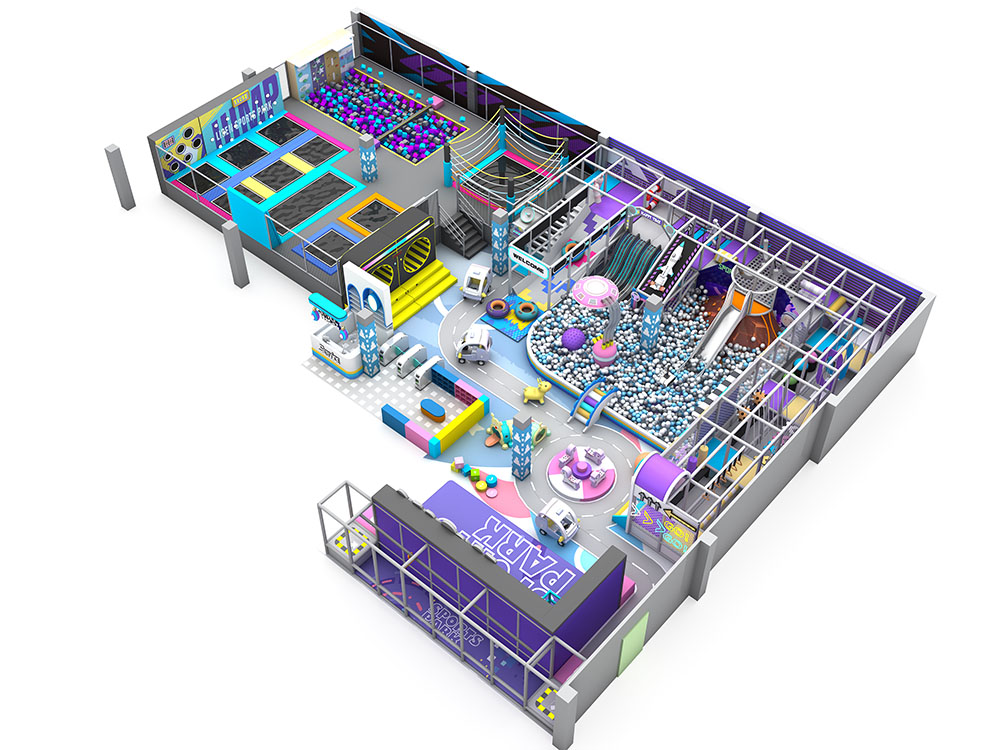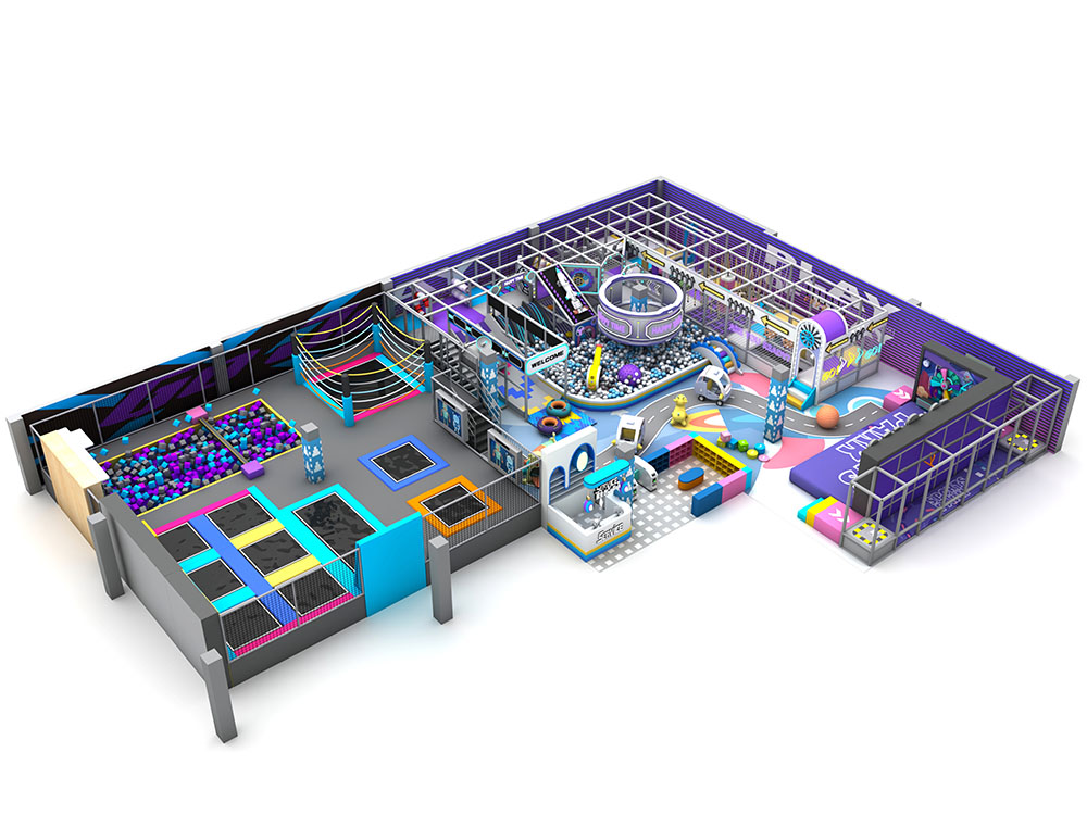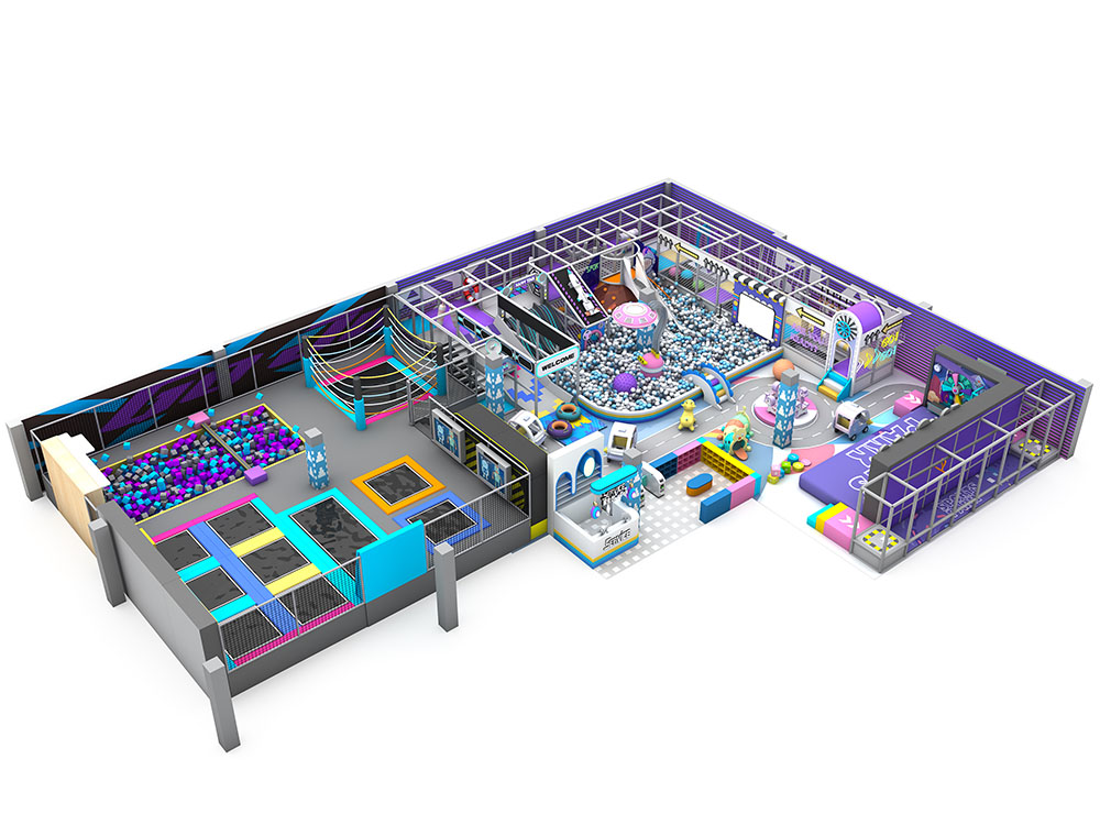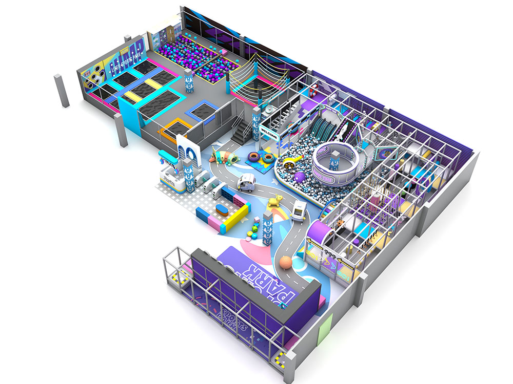 This giant indoor playground combines creativity, energy, and adventure into one exciting space for kids of all ages. It features colorful play structures, giant slides, ball pits, climbing nets, and trampolines, creating a dynamic environment where children can jump, explore, and interact freely. The bright purple and blue color theme enhances the playful atmosphere and keeps the space visually engaging.