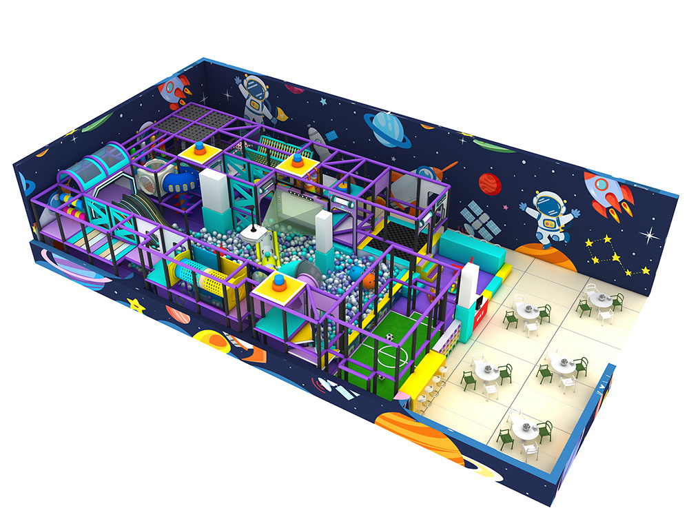 This good indoor play areas design features a stunning outer-space theme filled with rockets, planets, and astronauts that inspire children’s imagination. The playground includes a ball pit, tube slides, climbing frames, soft obstacles, and tunnels, offering a full range of safe and fun activities that promote both physical development and creative play.
