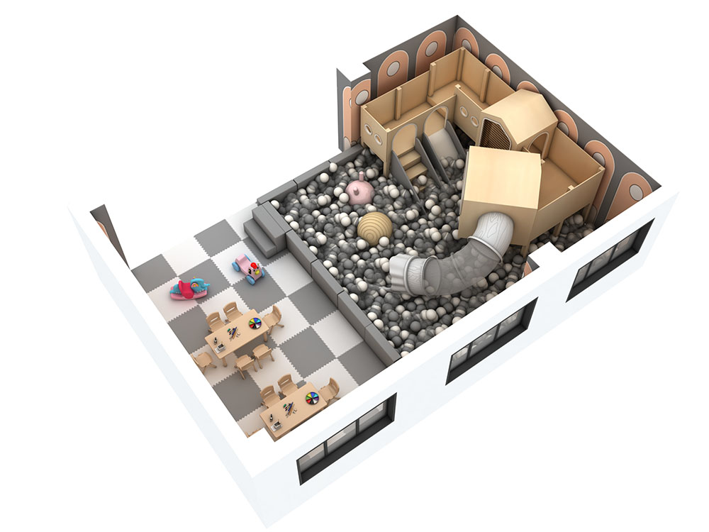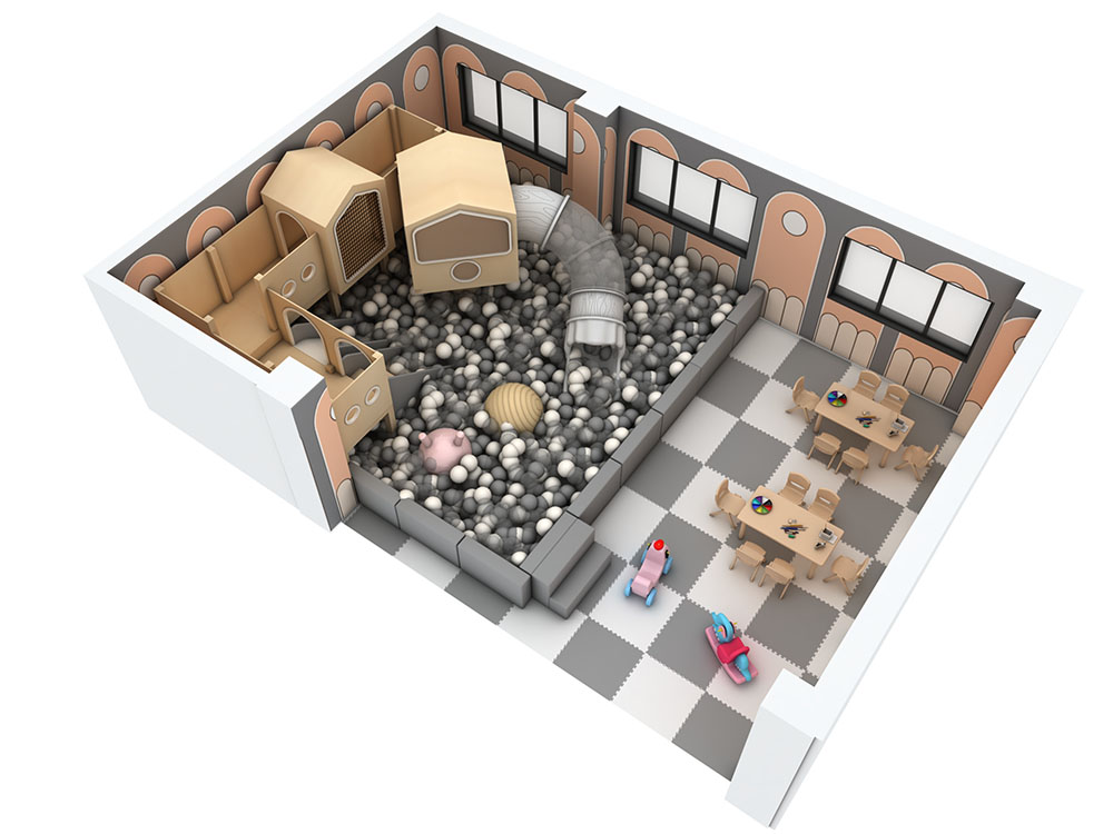 This cozy indoor play space features a warm brown color scheme with natural wood-like play structures, including tunnels, climbing areas, and a ball pit. The soft, earthy tones create a calm atmosphere, perfect for toddlers to explore and play safely. The adjacent seating area allows parents to relax while watching their children. With its well-organized layout and inviting design, this indoor play space is ideal for family-friendly venues, offering both fun and comfort in a stylish, secure environment.