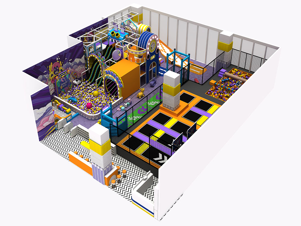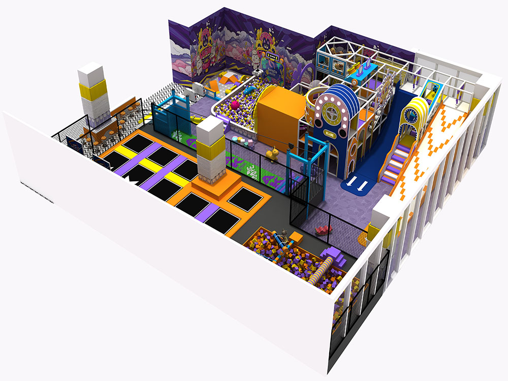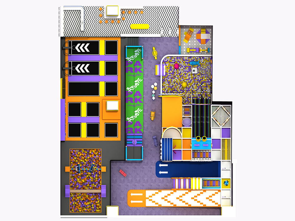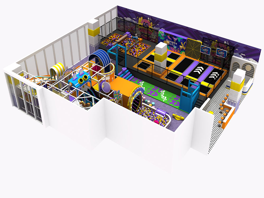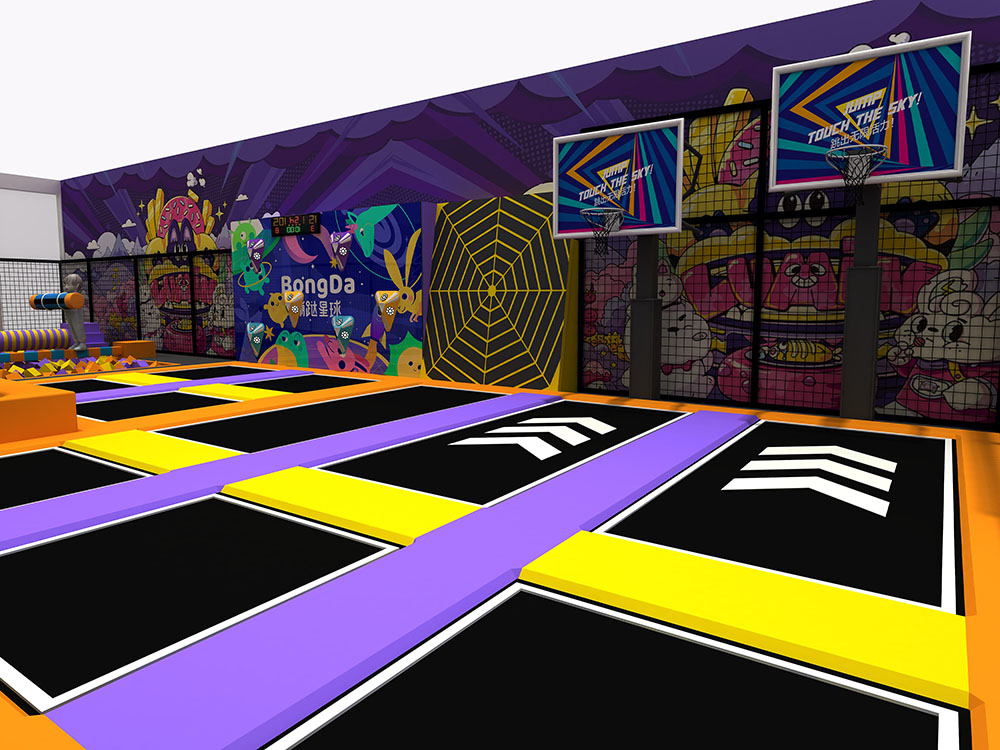 As a family-friendly jump nation trampoline park, the design also integrates colorful slides, ball pits, and enclosed play towers to add variety and longer play time. The clear zoning, safety padding, and mesh barriers ensure a secure experience, making it ideal for shopping malls, entertainment centers, and family leisure venues looking to offer both trampoline fun and soft play in one destination.