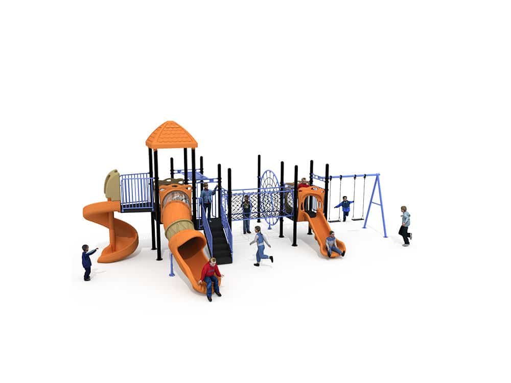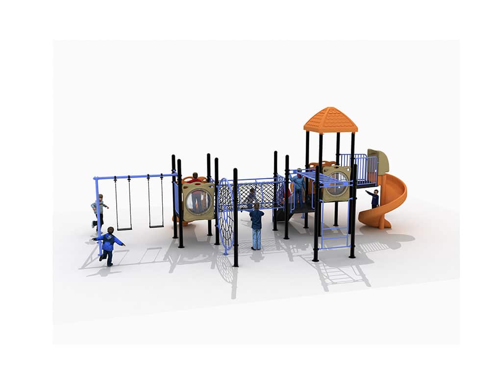 Our outdoor swing and slide set is the ultimate all-in-one playground solution for kids, designed to bring endless active fun to backyards, parks, and preschools. First, we craft this multi-play structure with multiple slides, swings, climbing nets, and elevated platforms, so children of all ages can play, climb, and explore together. Next, we build every component from heavy-duty, rust-resistant steel and durable, weatherproof HDPE plastic, so it stands up to years of sun, rain, and intense daily outdoor use. Additionally, we add smooth rounded edges, reinforced safety rails, and non-slip surfaces to ensure maximum safety during every play session. At the same time, the bright orange and blue color scheme is fade-resistant and visually engaging, making the playset a standout in any outdoor space. Finally, the modular design supports group play, fostering social skills, balance, and gross motor development.