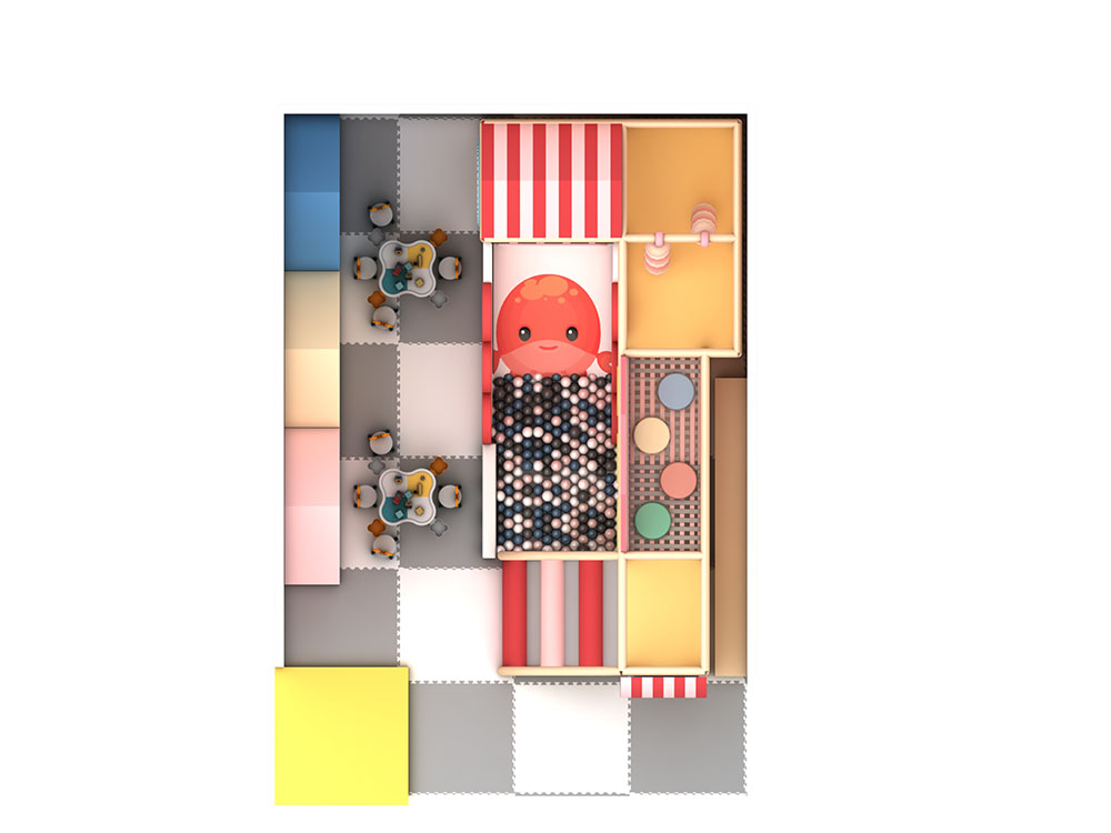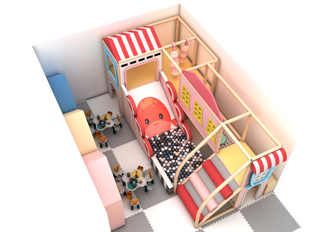 This indoor soft play area features a charming and compact design, perfect for younger children. With a cute animal-themed slide, a small ball pit, and colorful padded play zones, it offers a safe and fun environment for toddlers to explore and enjoy.