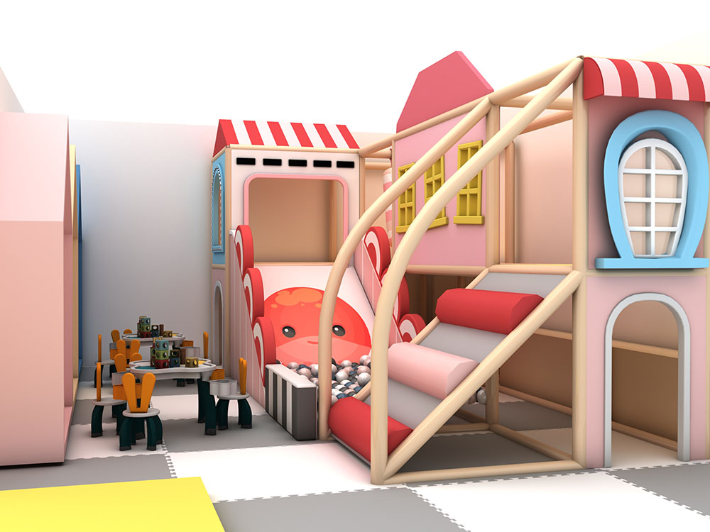 The indoor soft play area combines soft materials, pastel colors, and playful elements to create a cozy and cheerful space that encourages social interaction and active play.