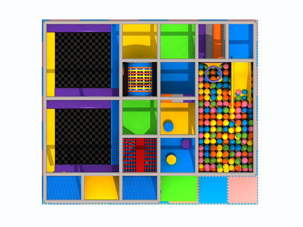 This indoor playground features modular soft play structures that integrate climbing nets, slides, tunnels, and a colorful ball pit, creating a safe and engaging space for children to explore. The enclosed frame ensures visibility and security, while padded floors and rounded elements protect active play. Designed for malls and family centers, the layout encourages movement, coordination, and social interaction through thoughtfully arranged soft play structures that support fun, learning, and confidence building.