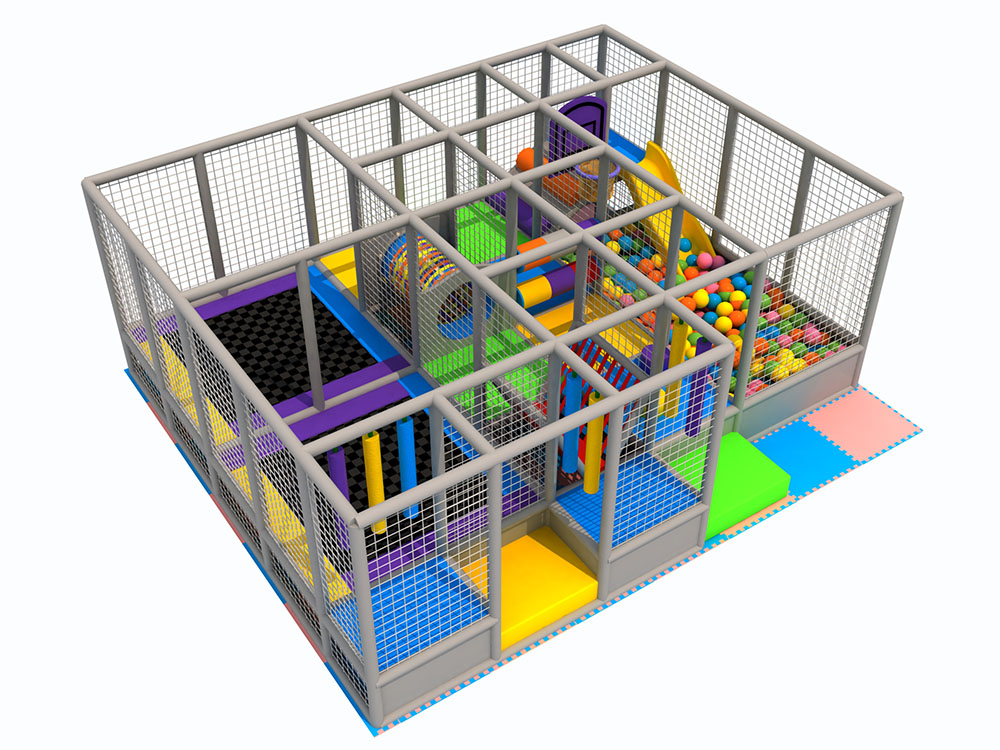 This indoor playground is designed with modular soft play structures that combine climbing nets, slides, tunnels, and a vibrant ball pit to create a fun and safe play environment. The enclosed grid frame offers excellent visibility and safety, while the bright padded elements encourage children to crawl, climb, and explore freely, supporting physical development and coordination.